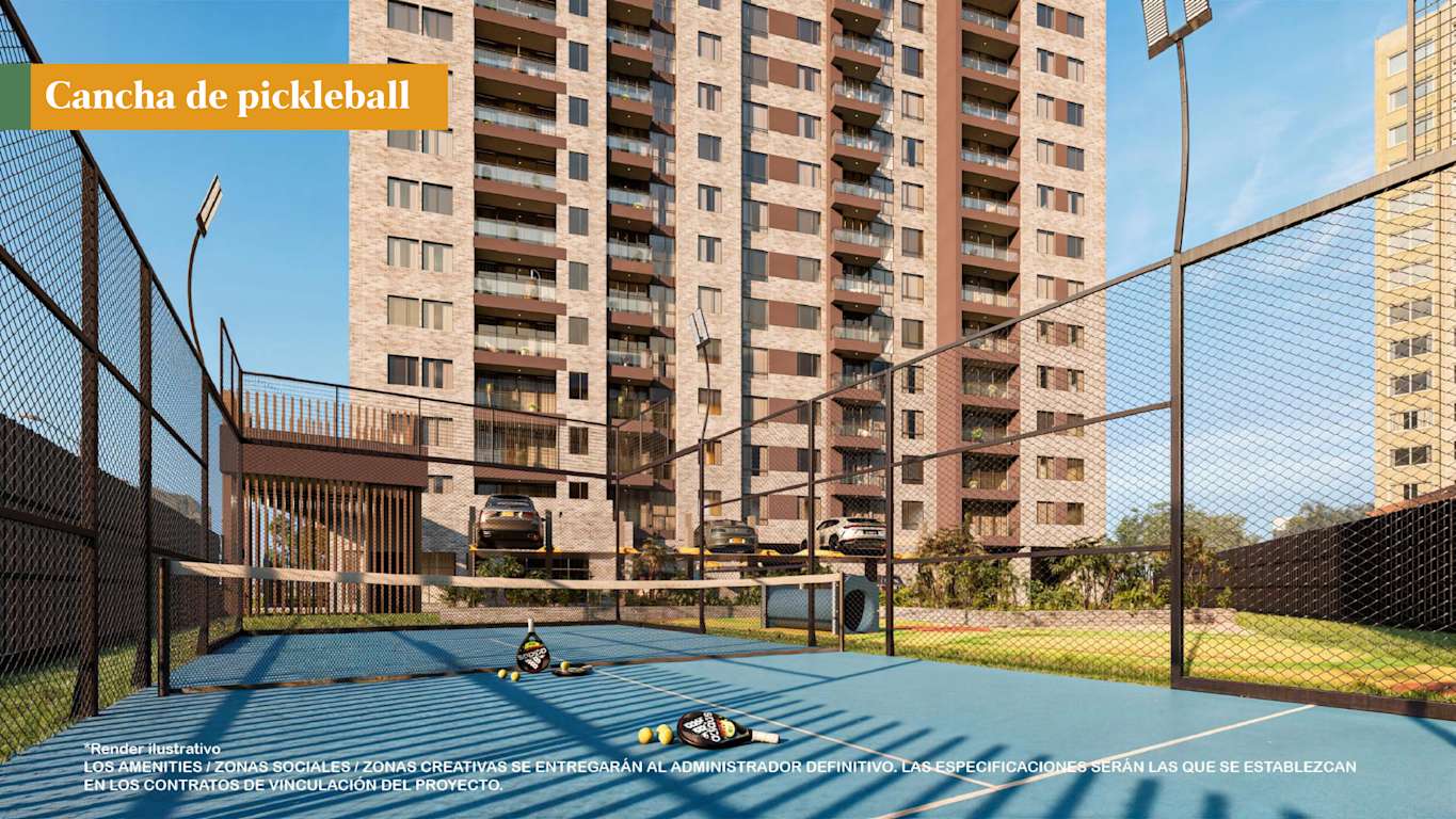 Contamos con Carga el éctrica y tubería para cuatro vehículos en parqueadero de visitantes (carga lenta) y zonas comunes como lobby, zona infantil, cancha de pickleball, gimnasio, zona bbq y salón social entre otros.