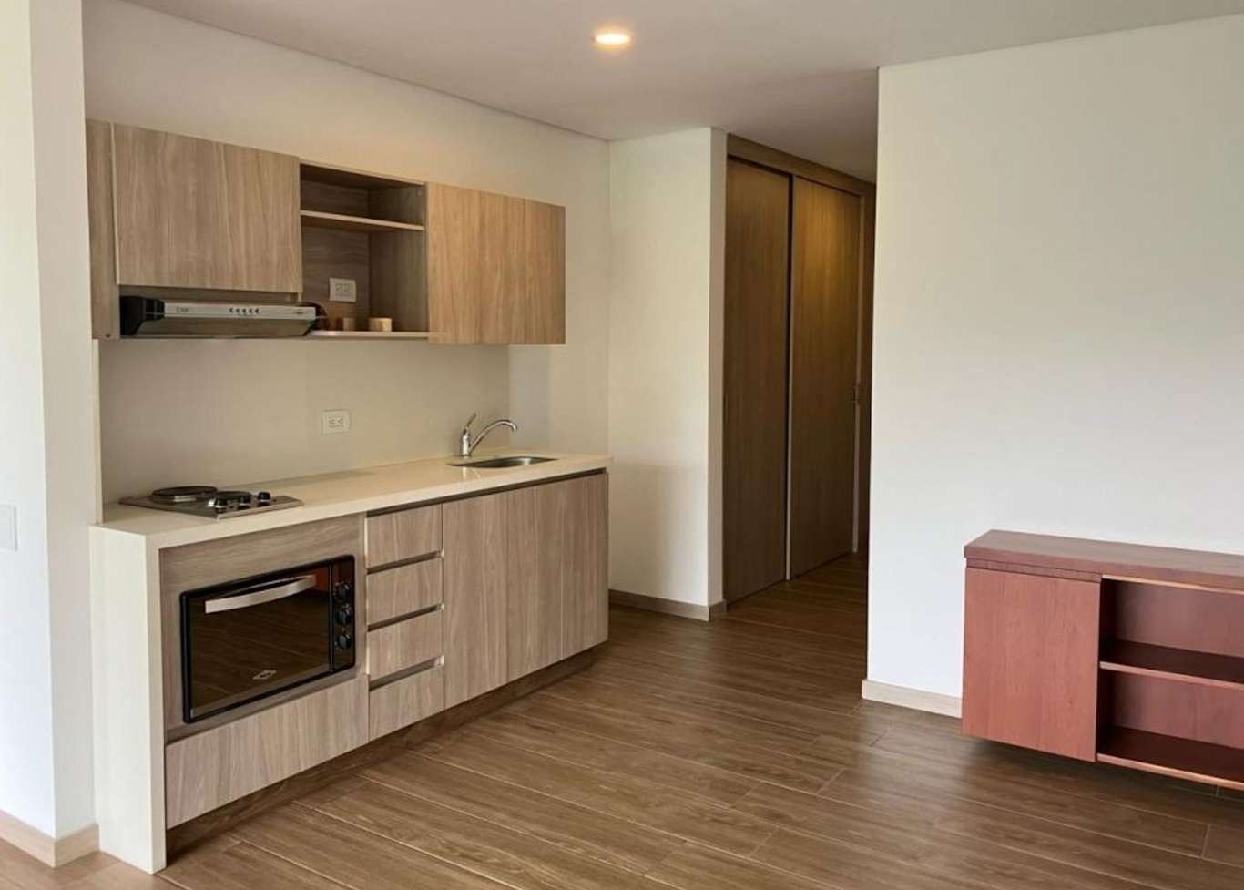 Modulo habitacional de una habitación con baño y vestier, salón comedor, dos baños completos, cocina integral abierta, zona de ropas y balcón.